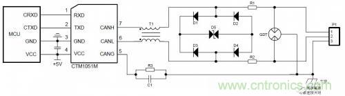 節點在戶外等惡劣的現場環境時,容易遭受大能量的雷擊,此時需要對CAN 信號端口添加更高等級的防護電路,保證節點不被損壞以及總線的可靠通訊。