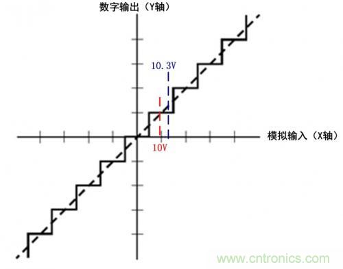 出現(xiàn)這種情況的原因首先是由測量設(shè)備內(nèi)部的ADC產(chǎn)生的量化誤差引起的,假設(shè)測量設(shè)備內(nèi)部包含一個(gè)11位的ADC,ADC共有211=2048個(gè)有效位,在1000V的量程(峰峰值)下,考慮最大±1000V的輸入共2048個(gè)有效位,則由于不可避免的噪聲的影響,ADC每跳動一個(gè)最小單位1LSB,產(chǎn)生的量化誤差大約會有2000V/2048≈1V。如果使用該量程測量10.3V這樣的信號,很顯然單次ADC取樣的最小分辨率已無法識別0.3V這樣刻度(在圖 2的量化示意圖中0.3V處在兩個(gè)刻度中間),當(dāng)然無法測得正確的值。如果無規(guī)則噪聲的峰值能大于1LSB時(shí),多次采樣取平均值后可以提高測量系統(tǒng)的有效位數(shù),但這樣的因素不在我們考慮的范圍之內(nèi)。