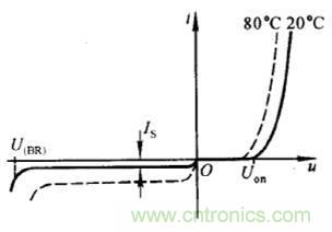 在環境溫度升高時,二極管的正向特性曲線將左移,反向特性曲線將下移,如圖1所示。在室溫附近,溫度每升高1℃,正向壓降減小2~2.5mV;溫度每升高10℃,反向電流約增大一倍。可見,二極管的特性對溫度很敏感。