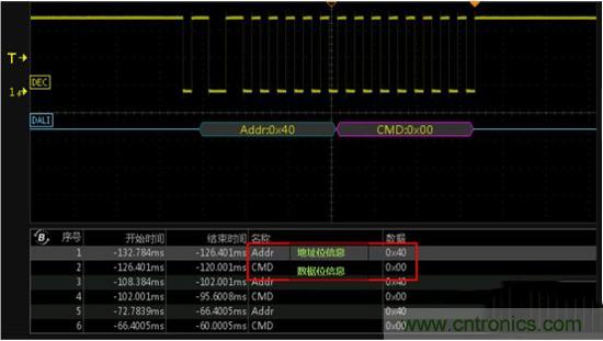 現場模擬照明控制DALI通信協議,這里用數據挖掘型示波器ZDS4054 Plus為例,其免費標配DALI協議解碼功能,可對全內存512Mpts的數據進行解碼,且可對照明控制器與鎮流器之間的信號監測,取其中一幀數據的信息在事件表中進行查看,如下圖6所示: