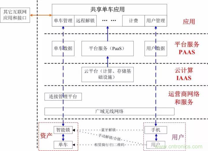 云端的共享單車應用系統集成外部的互聯網功能(例如支付、二維碼應用、電子地圖等),將單車和用戶連接起來,完成一套完整的租賃服務流程(地圖尋車-二維掃碼-用戶解鎖-騎行使用-合鎖還車-支付結算)。
