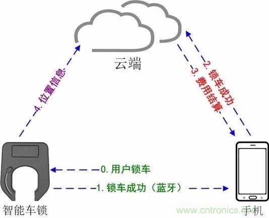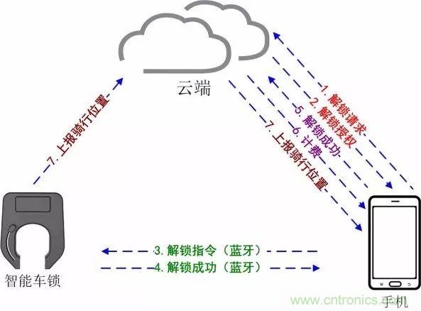 1.手機先掃單車上二維碼,而后向云端發起解鎖請求。(步驟1)