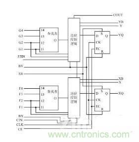 Slice是Xilinx公司定義的基本邏輯單位,其內部結構如圖1-4所示,一個Slice由兩個4輸入的函數、進位邏輯、算術邏輯、存儲邏輯和函數復用器組成。算術邏輯包括一個異或門(XORG)和一個專用與門(MULTAND),一個異或門可以使一個Slice實現2bit全加操作,專用與門用于提高乘法器的效率;進位邏輯由專用進位信號和函數復用器(MUXC)組成,用于實現快速的算術加減法操作;4輸入函數發生器用于實現4輸入LUT、分布式RAM或16比特移位寄存器(Virtex-5系列芯片的Slice中的兩個輸入函數為6輸入,可以實現6輸入LUT或64比特移位寄存器);進位邏輯包括兩條快速進位鏈,用于提高CLB模塊的處理速度。