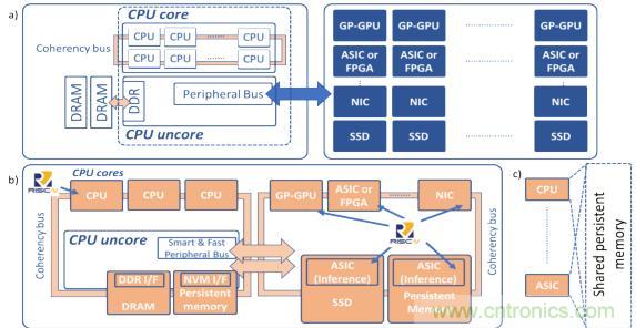另一個類似且重要的趨勢是大數據端和云端上數據的移動及訪問方式(圖2)。傳統的計算機體系結構(圖2a)采用慢速外圍總線,該總線連接到許多其他設備(例如,專用機器學習加速器、圖形卡、高速固態硬盤、智能網絡控制器,等等)。低速總線會影響設備的利用率,因為它限制了總線本身、主CPU以及主要的潛在持久內存之間的通信能力。這些新型計算設備也不可能在它們之間或與主CPU共享內存,從而導致在慢速總線上進行徒勞且受限制的數據移動。