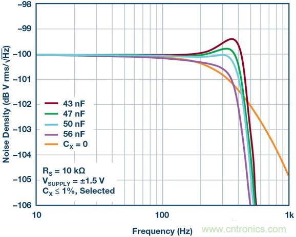 關鍵IC參數與運算放大器電源電流有關,低電源電流的器件可能需要稍大的CX,而高電源電流的器件很可能需要小于30 nF的電容,同時實現更寬的平坦帶寬。