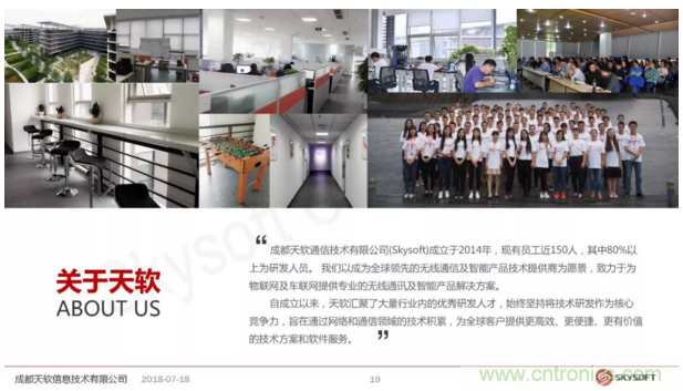 天軟信息成立于2014年,現有員工近150人,其中80%為研發人員。公司以成為全球領先的無線通信及智能產品技術提供商為愿景,致力于為物聯網及車聯網提供專業的無線通訊及智能產品解決方案。Skysoft是西部為數不多的擁有獨立綜合通信測試實驗室,并能提供LTE終端產品/模塊、無線路由器、車載通信及多媒體等軟硬件研發能力的高新技術企業。