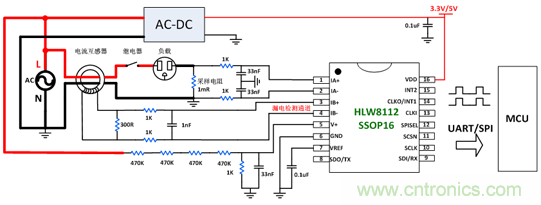 家電產(chǎn)品在長期使用后,隨著器件老化,會出現(xiàn)耗電量增加,甚至漏電,造成安全隱患。HLW8112在單通道基礎(chǔ)上增加1路電流檢測通道用于檢測設(shè)備漏電狀況。在圖2中,B通道通過電流互感器對負(fù)載設(shè)備進(jìn)行漏電檢測,當(dāng)負(fù)載設(shè)備發(fā)生漏電時,HLW8112通過INT2引腳輸出快速切斷設(shè)備電源,保護(hù)電器使用者安全。