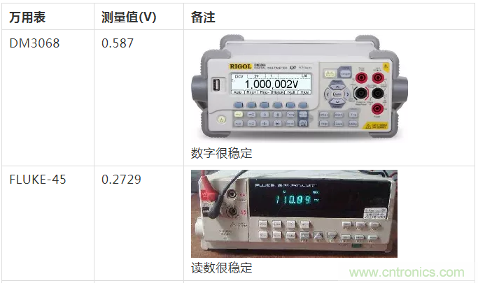 其中,讀數(shù)最高的是DM3068六位半的數(shù)字萬(wàn)用表,但顯示數(shù)值也僅有0.587V,比信號(hào)源輸出的1V低了42%。
