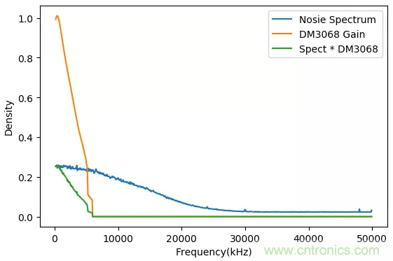 隨機(jī)信號(hào)頻譜(藍(lán)色),DM 3068頻譜特性(黃色),實(shí)際測(cè)量隨機(jī)噪聲各頻率分量的數(shù)值(綠色)