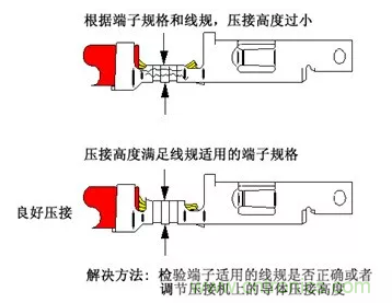 解決壓接高度過小或過大方法很簡單:可以嘗試調節壓接機上的導體壓接高度。在首次使用壓接機進行工作時,使用游標卡尺或千分尺檢驗壓接高度在規定范圍內,并且在工作過程中應按照要求的頻度重新檢查,以保持正確的壓接高度。