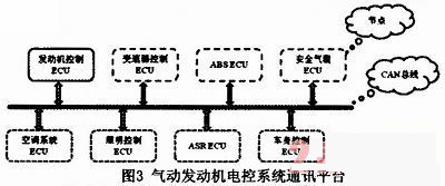氣動發(fā)動機(jī)的控制系統(tǒng)是極其復(fù)雜的,不僅包括轉(zhuǎn)速、油門位置等信號的采集處理;還要對電磁閥的噴氣定時和噴氣量完成精確控制等等。另外,氣動汽車上還包括ABS、空調(diào)系統(tǒng)和車輛燈光等模塊,這些模塊需要實(shí)時共享車輛的數(shù)據(jù),以達(dá)到整車的最優(yōu)控制。傳統(tǒng)的電氣控制設(shè)計策略已經(jīng)不能滿足當(dāng)今電氣控制網(wǎng)絡(luò)的需要,而CAN總線的數(shù)據(jù)通訊具有突出的可靠性、實(shí)用性和靈活性等特點(diǎn)。氣動發(fā)動機(jī)電控系統(tǒng)通訊平臺如圖3所示。它具有布線成本低、通訊速率高和數(shù)據(jù)傳輸精度高等優(yōu)勢。