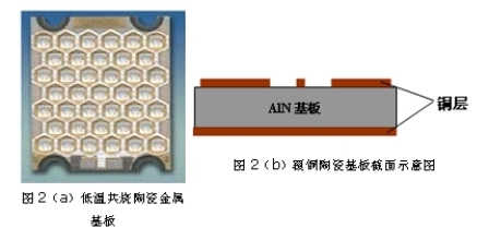 LED封裝熱阻主要包括材料(散熱基板和熱沉結(jié)構(gòu))內(nèi)部熱阻和界面熱阻。散熱基板的作用就是吸收芯片產(chǎn)生的熱量,并傳導(dǎo)到熱沉上,實(shí)現(xiàn)與外界的熱交換。常用的散熱基板材料包括硅、金屬(如鋁,銅)、陶瓷(如Al2O3,AlN,SiC)和復(fù)合材料等。如Nichia公司的第三代LED采用CuW做襯底,將1mm芯片倒裝在CuW襯底上,降低了封裝熱阻,提高了發(fā)光功率和效率;Lamina Ceramics公司則研制了低溫共燒陶瓷金屬基板,如圖2(a),并開發(fā)了相應(yīng)的LED封裝技術(shù)。該技術(shù)首先制備出適于共晶焊的大功率LED芯片和相應(yīng)的陶瓷基板,然后將LED芯片與基板直接焊接在一起。由于該基板上集成了共晶焊層、靜電保護(hù)電路、驅(qū)動(dòng)電路及控制補(bǔ)償電路,不僅結(jié)構(gòu)簡單,而且由于材料熱導(dǎo)率高,熱界面少,大大提高了散熱性能,為大功率LED陣列封裝提出了解決方案。德國Curmilk公司研制的高導(dǎo)熱性覆銅陶瓷板,由陶瓷基板(AlN或Al2O3)和導(dǎo)電層(Cu)在高溫高壓下燒結(jié)而成,沒有使用黏結(jié)劑,因此導(dǎo)熱性能好、強(qiáng)度高、絕緣性強(qiáng),如圖2(b)所示。其中氮化鋁(AlN)的熱導(dǎo)率為160W/mk,熱膨脹系數(shù)為4.0×10-6/℃(與硅的熱膨脹系數(shù)3.2×10-6/℃相當(dāng)),從而降低了封裝熱應(yīng)力。