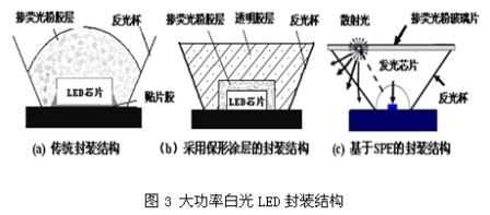 傳統(tǒng)的熒光粉涂敷方式是將熒光粉與灌封膠混合,然后點(diǎn)涂在芯片上。由于無法對熒光粉的涂敷厚度和形狀進(jìn)行精確控制,導(dǎo)致出射光色彩不一致,出現(xiàn)偏藍(lán)光或者偏黃光。而Lumileds公司開發(fā)的保形涂層(Conformal coating)技術(shù)可實(shí)現(xiàn)熒光粉的均勻涂覆,保障了光色的均勻性,如圖3(b)。但研究表明,當(dāng)熒光粉直接涂覆在芯片表面時(shí),由于光散射的存在,出光效率較低。有鑒于此,美國Rensselaer 研究所提出了一種光子散射萃取工藝(Scattered Photon Extraction method,SPE),通過在芯片表面布置一個(gè)聚焦透鏡,并將含熒光粉的玻璃片置于距芯片一定位置,不僅提高了器件可靠性,而且大大提高了光效(60%),如圖3(c)。