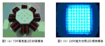 在系統(tǒng)集成方面,臺(tái)灣新強(qiáng)光電公司采用系統(tǒng)封裝技術(shù)(SiP), 并通過翅片+熱管的方式搭配高效能散熱模塊,研制出了72W、80W的高亮度白光LED光源,如圖5(a)。由于封裝熱阻較低(4.38℃/W),當(dāng)環(huán)境溫度為25℃時(shí),LED結(jié)溫控制在60℃以下,從而確保了LED的使用壽命和良好的發(fā)光性能。而華中科技大學(xué)則采用COB封裝和微噴主動(dòng)散熱技術(shù),封裝出了220W和1500W的超大功率LED白光光源,如圖5(b)。