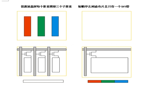 不僅如此,采用場順序以后,由于不需要再把每一個像素分為三個子像素,薄膜晶體管TFT也可以減少三倍,因此相當于像素面積加大了三倍;或者說,如果保持像素面積不變,在相同的屏幕尺寸下,可以將分辨率提高三倍.