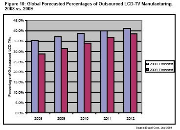 估計這一趨勢在2009年還將繼續,外包的LCD-TV比預期的少5.6%。到2010、2011和2012年,外包量將比先前預測的少4.8、3.2和2.6個百分點。