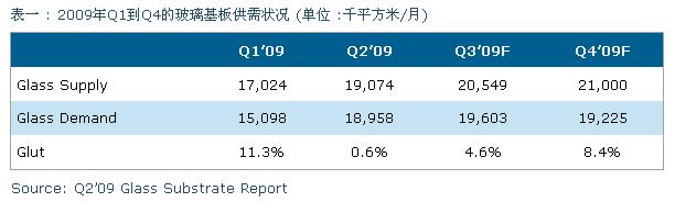 由此份報(bào)告中計(jì)算出玻璃基板的供需狀況(如下表),玻璃基板在2009年第二季每個(gè)月平均需求預(yù)估超過1千890萬平方米,較2009年 Q1成長(zhǎng)26%,而玻璃基板的供應(yīng)狀況從第一季到第二季僅成長(zhǎng)12%,供應(yīng)端成長(zhǎng)的速度遠(yuǎn)遠(yuǎn)趕不及需求的快速成長(zhǎng)。