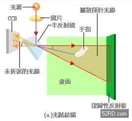 雖然傳統(tǒng)阻抗式薄膜觸控面板結構簡單、制作成本低廉,不過透明觸控薄膜經(jīng)常曝露在刮傷、破損的操作環(huán)境下。整體來看,使用容易、不需特殊操作工具、不需黏貼特殊膜片,成為新世代多媒體平臺用大型觸控面板的必備條件,因此研究人員決定採用光學方式,具體結構是讓雷射二極體的光線在畫面上通行,依此檢測筆或是手指觸壓位置(座標軸)。光學方式可以分為「檢測光線反射位置」以及「檢測光線被遮蔽位置」這兩種方式。