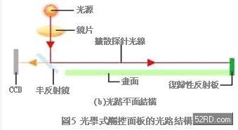 圖5是光學式觸控面板的光路結構,由圖可知,若掌握無法折返光線的角度,理論上就可以輕易求得使用者觸押面板的位置。