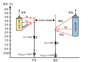 未來,新型鋰離子電池和LED技術將會為LED驅動帶來新的挑戰。配合最新的化學成果,電池電壓的范圍將擴大到2.3~4.7V,而典型的白光LED正向電壓將會下降至2.9V。與此同時,輸出驅動器的飽和電壓都會隨著下降。當采用并聯驅動時,要高效地驅動一個2.9V的LED,就需要動用一個升降壓轉換器。圖2所示為由電池、驅動器和LED技術的進步所帶來的效果。