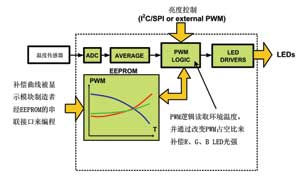 使用RGB背光時,當LED溫度改變時,驅動器必須更正紅、綠和藍三主色間的亮度平衡,以防出現白點位移。此外,還需保證驅動器在任何操作溫度下維持光的正確強度。而在補償方面,可以用閉環或開環形式。若使用閉環補償,便需采用感光器來測量白點和其強度。相反地,如使用開環補償,那溫度便需事先量度出來,并通過預先定義好的補償曲線來調節亮度的平衡。