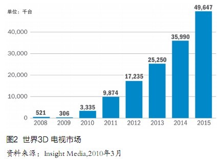 Insight Media市場(chǎng)研究公司3月發(fā)表的最新報(bào)告更加樂(lè)觀(guān),預(yù)測(cè)世界3D電視市場(chǎng)將從今年的340萬(wàn)臺(tái)飚升到2015年的4965萬(wàn)臺(tái),增長(zhǎng)10倍還多(圖2),屆時(shí)占有率將超過(guò)20%。其對(duì)手公司iSupp1i公司尤其樂(lè)觀(guān),認(rèn)為同期世界3D電視市場(chǎng)將從420萬(wàn)臺(tái)竄升到7800萬(wàn)臺(tái),占有率達(dá)40%,銷(xiāo)售額644億美元。