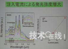 另外,該元件還呈現(xiàn)出如果增加注入電流、發(fā)光強(qiáng)度就會(huì)大幅提高的傾向,因此丸泉表示,“如果通過光子結(jié)晶形成共振器構(gòu)造,就應(yīng)該會(huì)產(chǎn)生激光振蕩。今后計(jì)劃將發(fā)光波長(zhǎng)變更為可用于通信的1.5μm頻帶。將在2~3年后開發(fā)出作為光開關(guān)工作的元件,并實(shí)現(xiàn)實(shí)用化”。