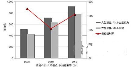 液晶面板的供求關(guān)系在2009年春季至2010年中期的1年多時間里,一直處于“供不應(yīng)求”及“供需平衡”狀態(tài)。但DisplaySearch預(yù)計,到2012年中國本土及外資企業(yè)的大量生產(chǎn)線“開始量產(chǎn)”時,整個FPD產(chǎn)業(yè)將“陷入供給過剩局面”。