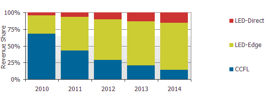 圖二: 2010-2013 按背光型態(tài)與出貨金額市占率