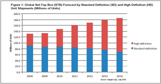 2010年全球STB出貨量將從2009年的1.328億個增長到1.465億個。增長主要來自高清STB,預計此類STB出貨量將從2009年的4520萬個增長到5920萬個,勁增1400萬個或31%。