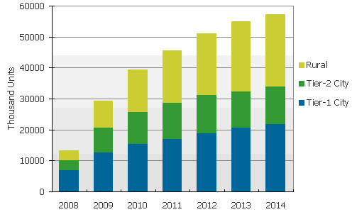 • 中國平面電視的出貨量將在2014年長至5千9百萬臺,年復合成長率為14%