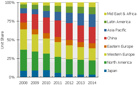 圖一 2008年到2014年中國液晶電視在不同區域的發展狀況