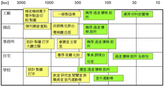 表一、各場所照明的基準