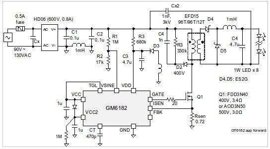 圖一GM6182高功因、高效率、具有EZDimming功能的LED驅動器