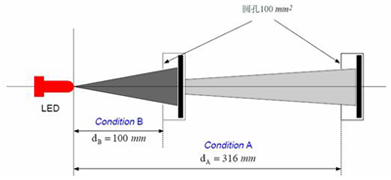 圖4中,點光源光強在空間各方向均勻分布,在不同距離處用不同接收孔徑的探測器接收得到的測試結果不會改變。但是,LED由于其光強分布不一致,使得測試結果隨測試距離和探測器孔徑而變化。因此,CIE-127提出了兩種推薦測試條件,使得各個LED在同一條件下進行光強測試與評價如圖5所示。目前,CIE-127推薦測試條件已經被各LED制造商和檢測機構引用。