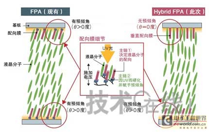 此次開發(fā)的Hybrid FPA僅在夾有液晶的一側(cè)基板上使用了賦予預(yù)傾角的配向膜。據(jù)稱,由此與兩側(cè)均配備賦予了預(yù)傾角的配向膜的原FPA相比,電壓關(guān)閉時液晶分子的響應(yīng)速度要快(圖1)。而且,在未賦予預(yù)傾角的基板一側(cè),液晶分子幾乎全部沿垂直方向配置,因此可減少漏光。由此比現(xiàn)有的FPA還提高了對比度。