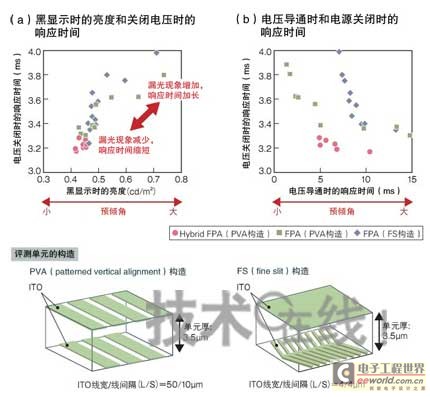 Hybrid FPA試制單元,其電壓關(guān)閉時的液晶分子響應(yīng)時間和黑顯示時的亮度與已有FPA的試制單元相比,均得到了改善(a)。而電源導(dǎo)通時的響應(yīng)速度稍慢于FPA(b)。(圖根據(jù)索尼的資料制作)[page]