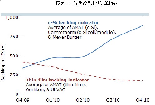 隨著2011年所公布的超越60%年度增長率的產(chǎn)能的擴張,首選設備供應商的訂單使得未結訂單總量創(chuàng)下新記錄,超過了2008年由高價格交鑰匙薄膜生產(chǎn)線業(yè)務推動的水平。2010年第四季度末,有20家設備供應商的訂單積累已經(jīng)超過了1億美金,這些訂單主要的出貨時間集中在2011年上半年。目前的未結訂單總量與2009年第四季度相比有26%的增長,導致2010年的訂單出貨比原高于上一年水平(1.24),其中2010年第二季度的更是創(chuàng)下了1.7的八季高點。