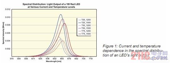 LED的光輸出特性主要取決于其工作條件。前向電流增加會使LED產生更多的光。但當前向電流保持不變,光輸出會隨著LED的溫度升高而下降。圖1描述了溫度,電流和光輸出的關系。并且描述了一個LED相關的顏色光譜在峰值波長處的偏移。用于普通照明的單色LED,藍色光譜的峰值會發生偏移,因此改變了LED所謂的色溫。這會對LED照明空間內的感官產生影響。