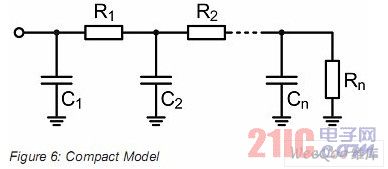 結構函數可以進一步轉變成簡化模型,也就是一個包含熱阻熱容的等效網絡,它包含了結構函數圖形中所包含的所有數值。圖6描述了類似功率LED等半導體元件的一個通用模型。當然,實際的模型中R和C會有具體的數值。
