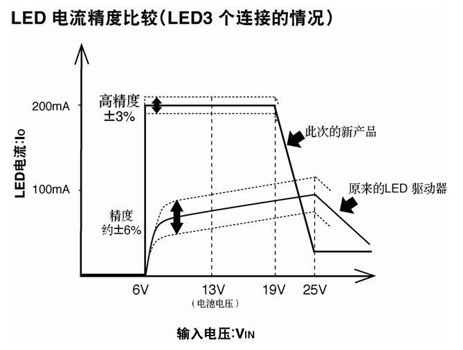 最近,汽車尾燈改裝LED燈的發(fā)展速度驚人,以低耗電量、長壽命這一優(yōu)點為背景,今后也將日益推進(jìn)汽車尾燈的LED化。此外,目前的LED尾燈是采用了10~20個LED發(fā)光二極管組成形式,但隨著LED的高亮度化和向普及型汽車的滲透, 減少LED發(fā)光二極管數(shù)量和其他器件用量的需求增高。在這樣的市場潮流中,即使是LED驅(qū)動器IC,對高精度化,高功率方面的需求也越來越高。因此,急需開發(fā)出車載尾燈用高性能LED驅(qū)動器。此次羅姆開發(fā)的尾燈專用LED驅(qū)動器IC, 因確保了200 mA的輸出電流,與以往的LED驅(qū)動器相比,輸出電流增加了3~5倍左右,從而使LED的高亮度化成為可能。另外,由于大幅改善了輸出電流精度,增大了LED誤差的容許范圍,尾燈組裝工序的成品率大幅改善。再有驅(qū)動方式采用了源驅(qū)動方式,驅(qū)動IC電路板與LED電路板的結(jié)線,與以往的同步驅(qū)動方式的2處相比,削減到1處后, 可以很容易實現(xiàn)車載用途所要求的開/短路檢測。再有,尾燈點燈時和剎車燈點燈時的亮度(電流量)可以自由設(shè)定的獨立電流設(shè)定等,在很大程度上方便了車載尾燈的設(shè)計。由P-BUS功能及LED開/短路檢測保護(hù)功能得以實現(xiàn)的故障安全功能也更加充實。