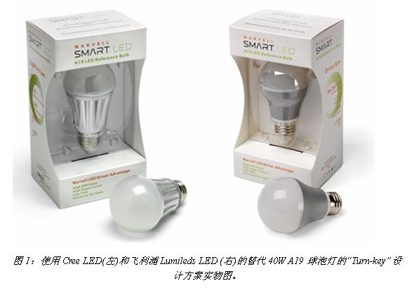 目前Marvell公司提供的超低功耗A19型交鑰匙設計方案和燈泡實物包括兩種(見圖1),均可用于替代40W的A19型球泡白熾燈:一種是采用4顆照明級別Cree XLamp® XP-E高效白光LED的方案;另一種是采用飛利浦Lumileds LUXEON® A LED的方案。此外,Marvell還推出了采用Cree XLamp® MT-G產品的PAR38射燈交鑰匙解決方案,用于替代100W的傳統此類燈具。同時,Marvell還在開發A19 60W等效LED燈泡方案,很快也將與中國客戶見面。