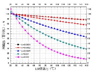 圖2 不同k值LED的光輸出(百分比)隨結(jié)溫的變化關(guān)系
