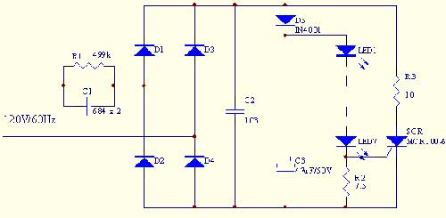 在圖二電路中﹐可控硅SCR及R3組成保護電路﹐當流過LED的電流大于設定值時﹐SCR導通一定的角度﹐從而對電路電流進行分流﹐使LED工作于恒流狀態﹐從而避免LED因瞬間高壓而損壞。