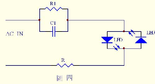 圖四是一個最簡單的電容降壓應用電路﹐電路中利用兩只反并聯的LED對降壓后的交流電壓進行整流﹐可以廣泛應用于夜光燈﹑按鈕指示燈﹐要求不高的位置指示燈等場合。