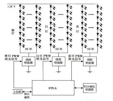 以FPGA作為控制器,根據(jù)上位機的調光指令調整PWM 占空比,從而控制背光亮度;采樣顏色傳感器的數(shù)據(jù),微調橙燈和藍燈的PWM 占空比,保證在溫度發(fā)生變化時色溫不變。