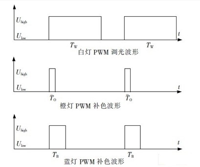 圖2 白燈及補色彩燈的PWM 調光波形圖。