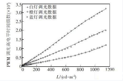 在SS-230平板顯示系統(tǒng)綜合分析儀器上,從低亮度到高亮度變化測量出40個點,調整3種燈的PWM脈沖高電平時間,得到標準白色光源。然后采用線性擬合的方法得到亮度不同情況下3種燈的PWM波形高電平持續(xù)時間的比例關系,根據(jù)該關系調光可以保證整個亮度范圍內(nèi)背光源是標準白色光。根據(jù)顏色傳感器輸出的紅、綠和藍3顏色通道數(shù)據(jù),微調橙燈和藍燈的PWM 高電平時間,維持紅、綠和藍3顏色通道數(shù)據(jù)的比例關系不變則色溫恒定。采用以上辦法得到出屏白場色溫在(6 500±100)K以內(nèi),色坐標u′在0.198±0.01以內(nèi),v′在0.468±0.01以內(nèi)的標準白色光。