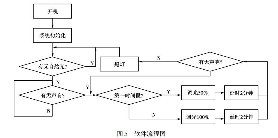 (2)當(dāng)無光(自然光)時(shí),若有人經(jīng)過產(chǎn)生聲響,控制器先判斷時(shí)間段,若是在天色完全暗下來時(shí)(定義為第一時(shí)間段),則使LED發(fā)出100%亮度。其余時(shí)間段即天色還較亮,控制器可輸出50%占空比方波,使LED發(fā)出50%亮度即可,這樣可進(jìn)一步節(jié)省電能,提高用電效率。