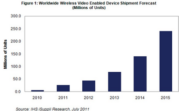 這類(lèi)支持無(wú)線(xiàn)視頻的設(shè)備包括智能手機(jī)、筆記本電腦和媒體平板,2015年出貨量將從2010年的660萬(wàn)個(gè)增長(zhǎng)到2.411億個(gè),復(fù)合年度增長(zhǎng)率高達(dá)105.1%,如圖1所示。